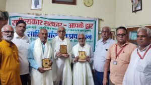 उत्कृष्ट साहित्यिक पुस्तकों के प्रकाशक साहित्यांजलि प्रकाशन प्रयागराज द्वारा विगत वर्ष से चलाई जा रही *साहित्यकार सत्कार: आपके द्वार सम्मान योजना के अन्तर्गत नगर के तीन वरिष्ठतम ख्यातिप्राप्त साहित्यकार पंडित राम लखन शुक्ल , पं० दयाशंकर पाण्डेय और श्रीराम मिश्र तलब जौनपुरी जी को अल्लापुर में *साहित्य रत्न सम्मान* प्रदान किया गया।